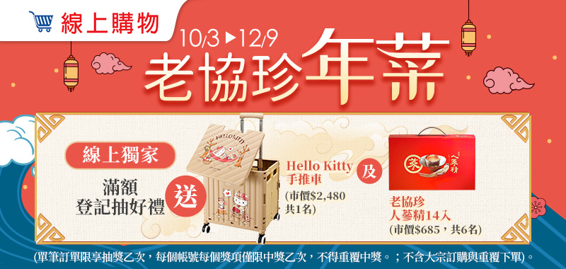 - 1.凡於2025/10/03-2025/12/09,活動期間,購買指定老協珍年菜系列折扣後滿$2,000登記抽Hello Kitty手推車(市價$2,480,共1名)及老協珍 人蔘精14入(市價$685,共6名)