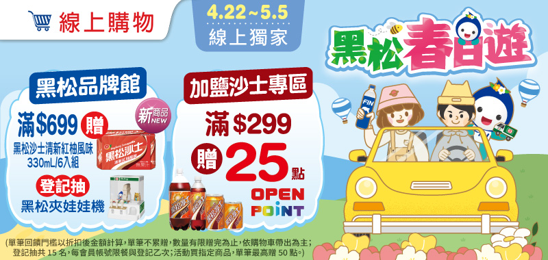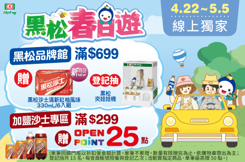 - 凡於2026/04/08-2026/04/21活動期間,購買黑松/立頓全品項折後滿$699登記抽黑松夾娃娃機(共30名)(單筆訂單限享抽獎乙次,每會員帳號限中獎乙次;不含大宗訂購與重覆下單)。